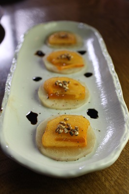 昨日は京都市美術館で一緒に働いていたfumico姉さまが家に遊びに来てくれました。 お土産に本田味噌の金山寺みそと栗みそ(秋限定だそう!)、 そして手作りのピアスを頂きました(^^) 栗みそは、初めて!!どうやって頂こうかなぁ。 またお知らせします(^^)/ ピアスもうれしい♪揺れる長めのピアスを作ってくれました。ありがとう★ ************************** お料理はこちら。 柿とヤーコンのサラダ バルサミコソース ヤーコンと柿は一緒に食べると美味しい♪食感の違いが楽しい一品。バルサミコソースの酸味とも相性抜群! ・里芋のポタージュ ・生春巻き スイートアーモンドペースト ・いんげんのアマランサス焼き ・蕪のオーブン焼き そして、おなじみ、米糠入りの生地でピザ。 里芋のピザ 豆乳とトマトで作ったソースにたっぷりの玉葱と里芋のスライスをのせて焼き、サニーレタス、バジルをのせて頂きました。 かぼちゃのピザ 塩蒸ししてマッシュした南瓜をのせて、ナツメグをかけました。 ワインは 2010年 「パゴ・デ・サルサス ソーヴィニヨン・ブラン」 フレッシュな酸味がお野菜の料理ともよく合います。 美味しいお酒と楽しい仲間と最高の時間。 PR |